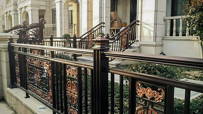 2、裝飾效果:不同顏色的粉末噴涂可以賦予鋁藝護欄不同的視覺效果。暖色系(如紅、黃、橙)會使人聯(lián)想到光、熱血,帶來溫暖的感覺;而冷色系(如藍、紫、綠)則給人一種幽靜清冷的感覺。選擇合適的顏色可以提升整體裝飾效果,使鋁藝護欄與周圍環(huán)境更加協(xié)調(diào)。
